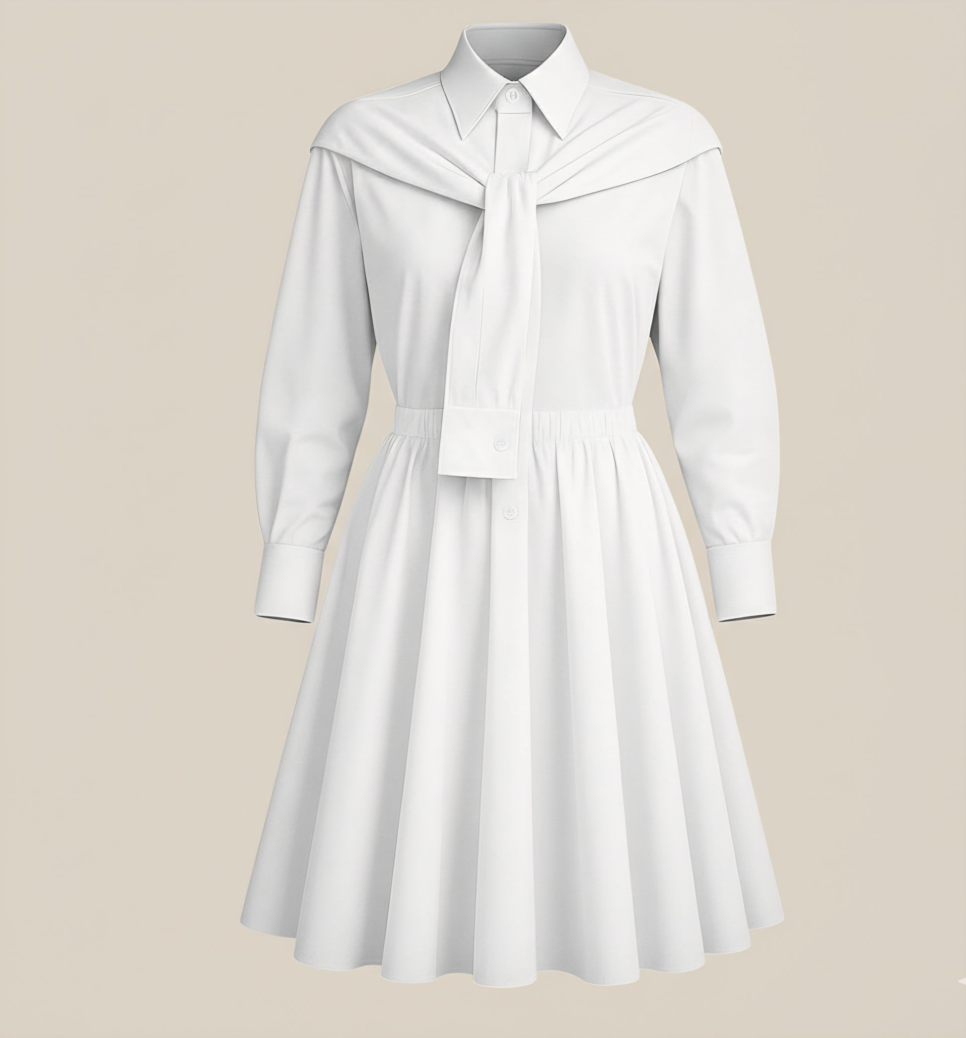 Effortlessly tailored for modern sophistication, this white cotton shirt dress blends classic structure with feminine ease. Featuring a crisp collared neckline, long sleeves, and an attached tie detail draped across the shoulders, it redefines everyday elegance. The elasticated waist adds comfort and subtle shape, while the full A-line skirt flows with graceful movement.
